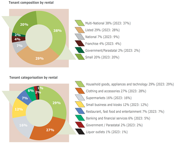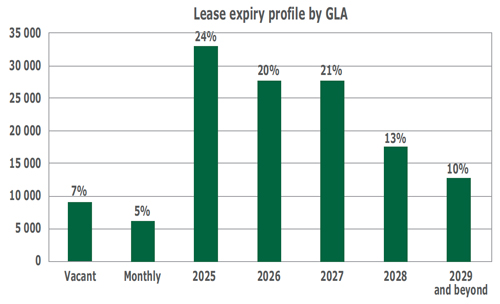 Monthly tenancies have reduced year on year by 16.9%. Just above a third of leases expiring (in terms of GLA) in the 2025 financial year are almost equally split between Mafenyatlala and the Riverwalk node. Management remains confident on the renewal of the vast majority of these leases.