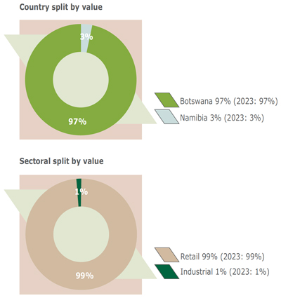 There have been no changes to the portfolio during the year and it remains weighted towards the Botswana retail sector, with some exposure to the Namibia retail sector (3%) and Botswana industrial sector (1%). The total portfolio comprises 60 properties in Botswana and 7 properties in Namibia. The three units damaged as a result of a fire at Kasane Mall at the beginning of the financial year have been reinstated and the tenants are trading.